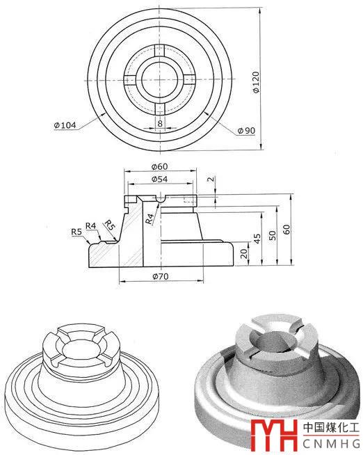 這個(gè)模型的三維建模操作并不復(fù)雜,主體模型是一個(gè)三維的旋轉(zhuǎn)體REVOLOVE,然后跟拉伸EXTRUDE的凹槽做一個(gè)布爾運(yùn)算,模型就算完成了。其實(shí)更多時(shí)間還是要花在繪制二維截面的繪制上,關(guān)于二維繪圖的步驟這里就不詳細(xì)介紹了,如果對二維繪圖還不熟悉,可以先看看信息里的二維練習(xí)。這里大家重點(diǎn)看看下面演示中三維建模的操作步驟。