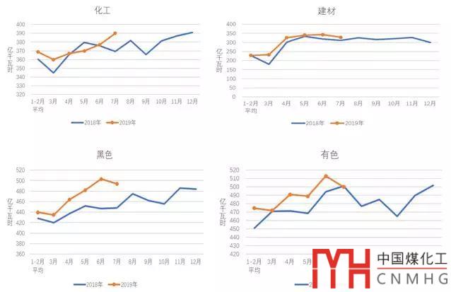 圖3 2018、2019年重點(diǎn)行業(yè)分月用電量情況