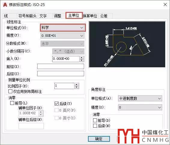 單位對(duì)話框中設(shè)置的是圖中各處顯示數(shù)值的單位,標(biāo)注并不受這個(gè)單位的控制,標(biāo)注默認(rèn)也可以支持16位,大于1E+16后就會(huì)用科學(xué)計(jì)數(shù)法顯示,不過這樣的數(shù)值在常規(guī)繪圖中不會(huì)遇到。當(dāng)然,如果需要的話在標(biāo)注樣式的主單位選項(xiàng)卡中我們也可以直接將單位格式設(shè)置為科學(xué)計(jì)數(shù)法。