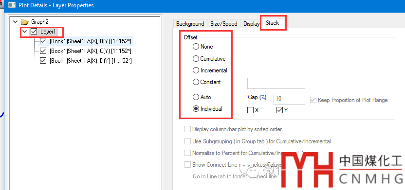 調(diào)整Stack中Offset類型,有Cumulative,Incremental,Constant多種形式。Individual中可以選擇在X方向和/或Y方向上實(shí)現(xiàn)堆疊。