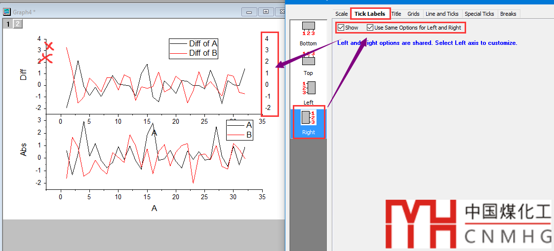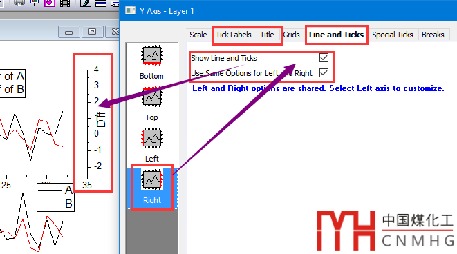 上圖的右側(cè)坐標(biāo)軸,Tick Labels,Title和Line and Ticks三個(gè)選項(xiàng)設(shè)置和左側(cè)一樣,然后刪掉左側(cè)坐標(biāo)軸的Tick Labels,Title和Ticks,保留Line