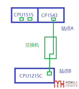 A站點的CP1543通過一條網線連接到交換機上,B站點的CPU1215C的網口1通過一條網線連接到同一個交換機上,項目的簡單網絡拓撲圖如下: