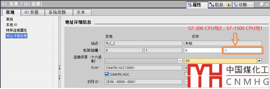 在“地址詳細信息”欄中,添加通信伙伴的TSAP。注意,重點來了!由于我們使用的是S7-1500系列CPU,因此在通信伙伴的插槽號中應該填寫數字1(如果是S7-300系列CPU,此處應該寫2),如下圖: