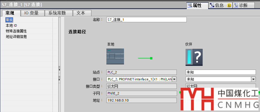 打開“S7鏈接”的屬性頁面,在“常規(guī)”欄中,添加通信伙伴的IP地址。如下圖: