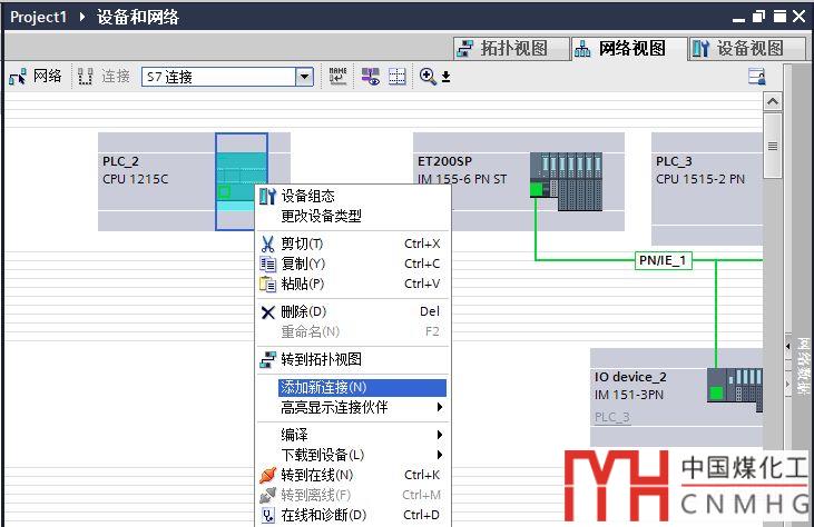打開CPU1215C的網絡視圖,點擊“連接”,選擇“S7連接”,可以看到CPU1215C變成了淺綠色。右鍵單擊CPU1215C,在彈出的菜單中選擇“添加新連接”,如下圖: