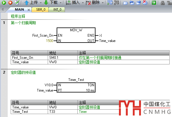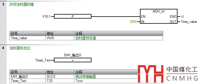 地址VW0用來存放定時(shí)器T33的預(yù)設(shè)值。在CPU的第一個(gè)掃描周期,將其賦值為15s(原題中的500ms和200ms時(shí)間太短,不便于觀察);