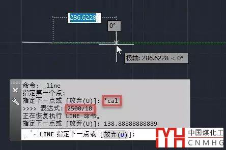 通常我們都是在繪圖的過程需要利用這類的計算值,也就是在執(zhí)行繪圖或編輯命令的過程中進行這類的計算,此時如果要調(diào)用計算器,我們就需要在CAL命令前輸入一個單引號‘,這種在執(zhí)行命令過程中可調(diào)用的命令叫做透明命令,比如我們可以在指定直線第一點后在提示指定第二點的時候輸入'cal回車,然后輸入算式得到直線的長度值,如下圖所示。