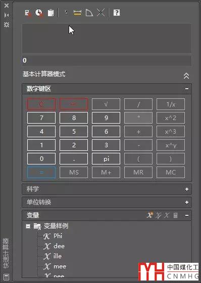 CAD當(dāng)前版本提供了兩種計算器,一種是快速計算器,是一個跟WINDOWS計算器類似的一個對話框,輸入QCAL命令回車或按CTRL+8可以打開,如下圖所示。