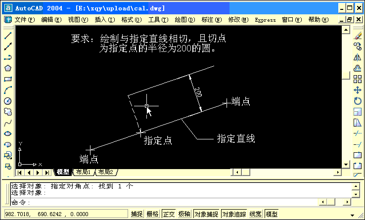 在這個例子中在指定位置繪制了一個點對象,在算式中輸入的nod+200*nee,nod是利用節(jié)點捕捉來獲取點對象的坐標(biāo),然后我們在這個點的坐標(biāo)基礎(chǔ)上加上200*直線的垂直矢量,就找到我們需要繪制圓的圓心。