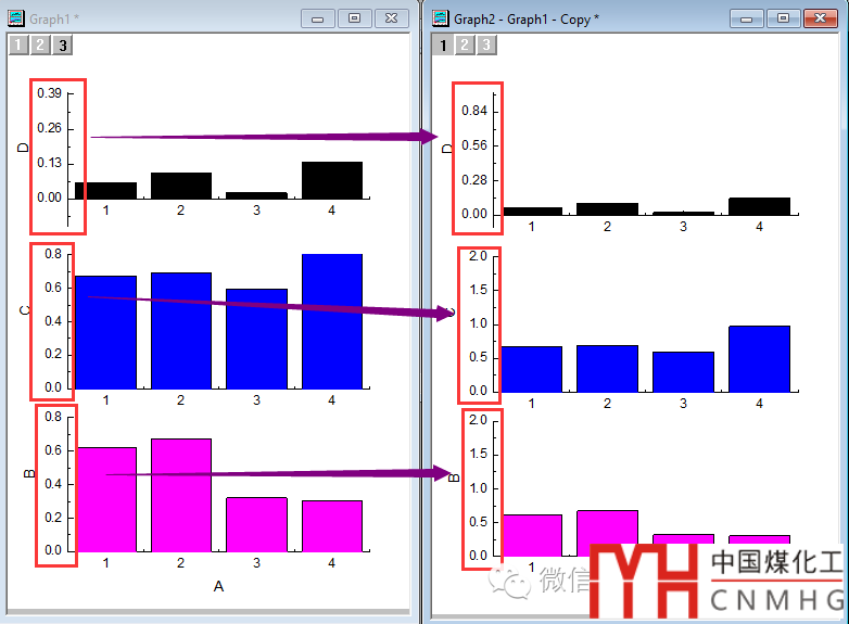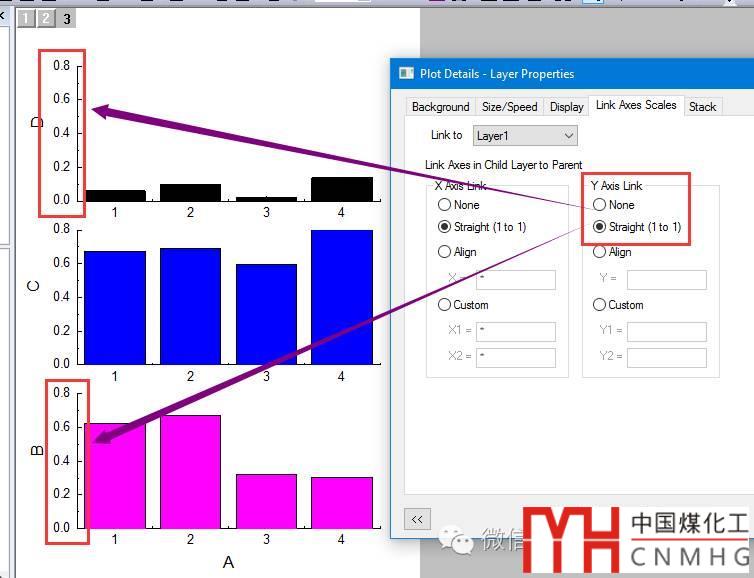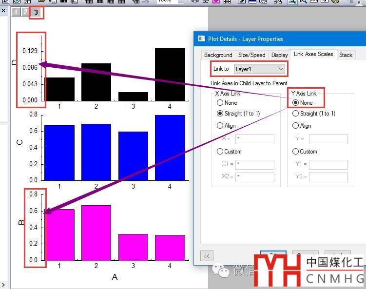 若Y Axis Link也設(shè)置為Straight(1 to 1),則圖層3中Y軸的尺度與Linked圖層(Layer 1)一致,圖層3中的柱形圖也“矮”了許多,便于比較同類數(shù)據(jù)的差異。