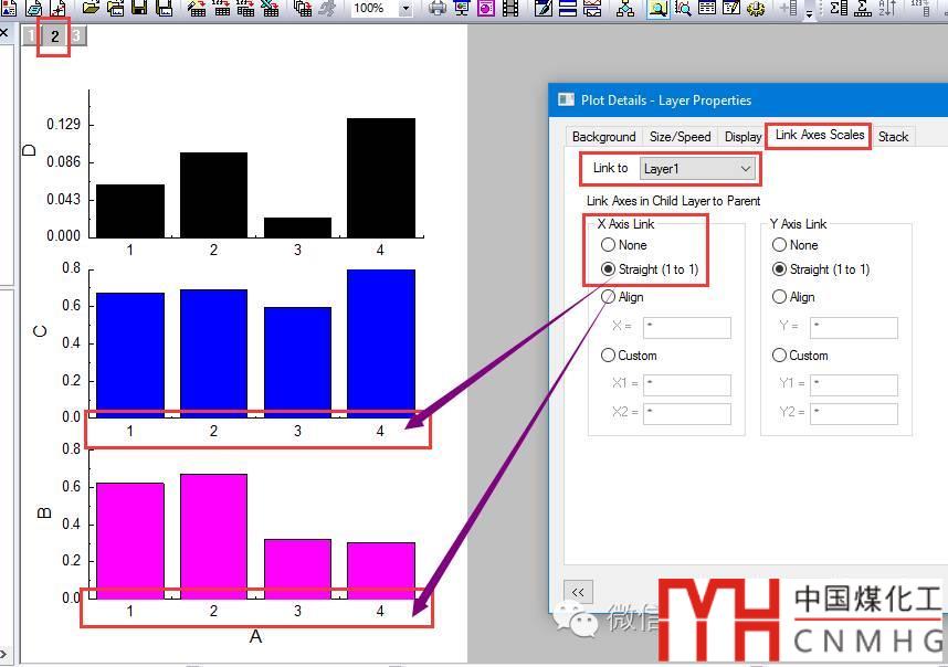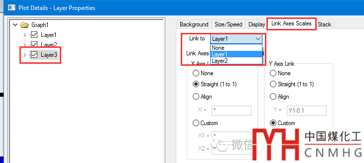 對(duì)于共有X軸數(shù)據(jù)的多圖層圖形,X Axis Link為Straight(1 to 1),即該圖層中的X軸與Linked圖層(Layer 1)具有相同的標(biāo)尺(Scale)。
