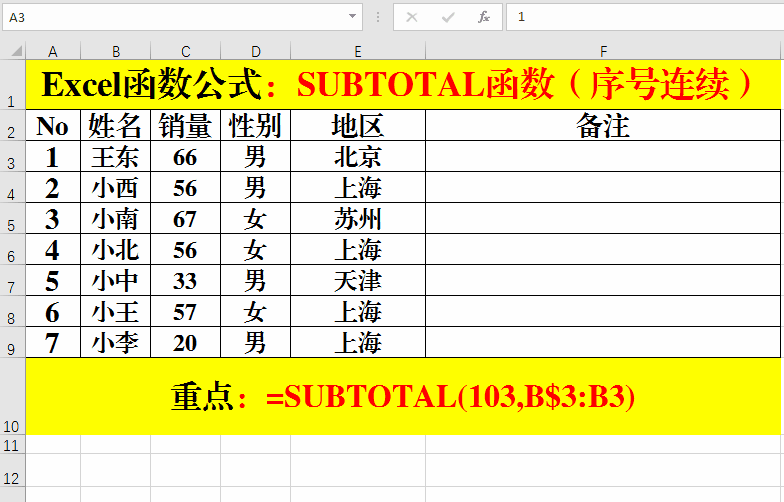 2、所以公式=SUBTOTAL(103,B$3:B3)統(tǒng)計(jì)的就是從B3開始到當(dāng)前單元格累計(jì)非空單元格數(shù)。