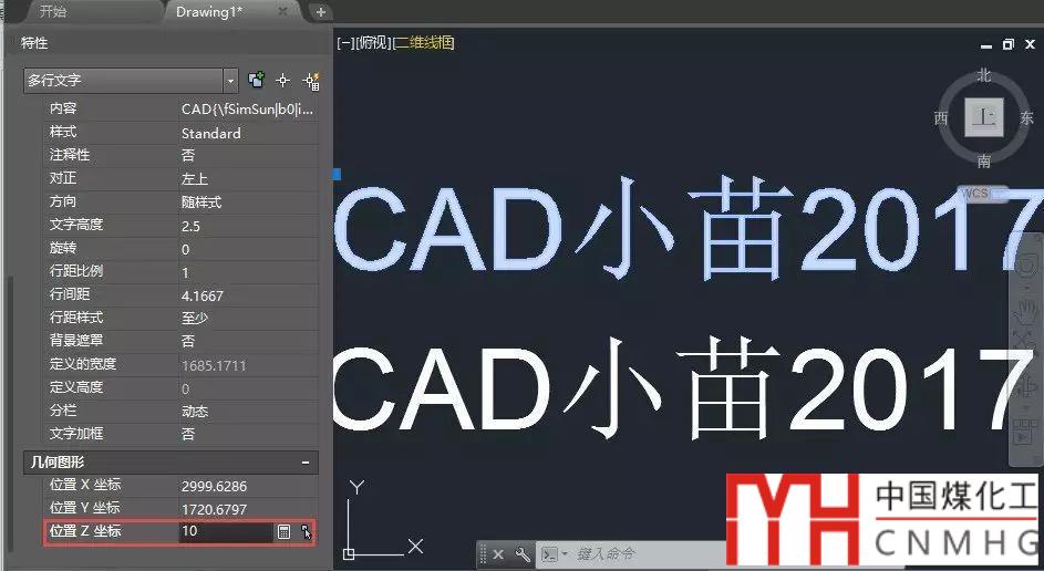 2、 選中文字,輸入CO,回車,復制一份文字到上方。選中復制的文字,打開特性面板(CTRL+1),在特性面板中將Z坐標設置為10,如下圖所示。