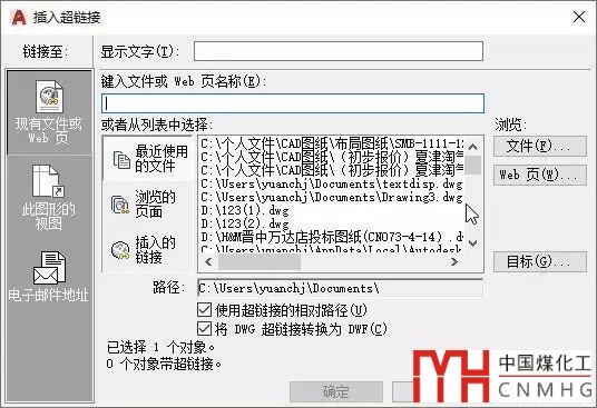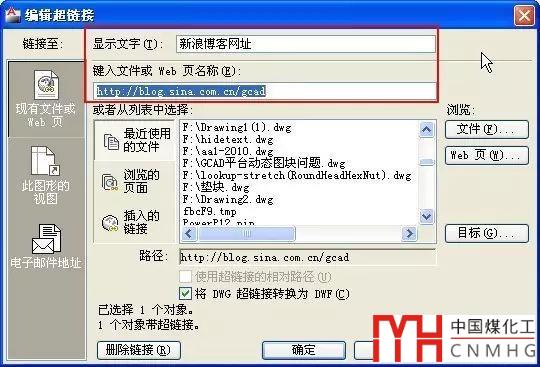 這個對話框看上去好復雜,左側有一個“鏈接至”列表,中部有“從列表中選擇”的列表,右側有“瀏覽”的列表,其實他們的作用是類似的,只是看你使用哪一種模式更方便,還可以直接在“鍵入文件或WEB頁名稱”的文本框中輸入圖紙文件名或網(wǎng)址,上面的顯示文字可以直接用網(wǎng)頁或文件名,也可以設置成自己需要的名字,如下圖所示。