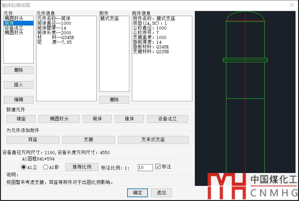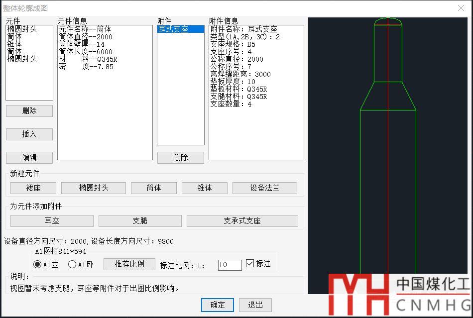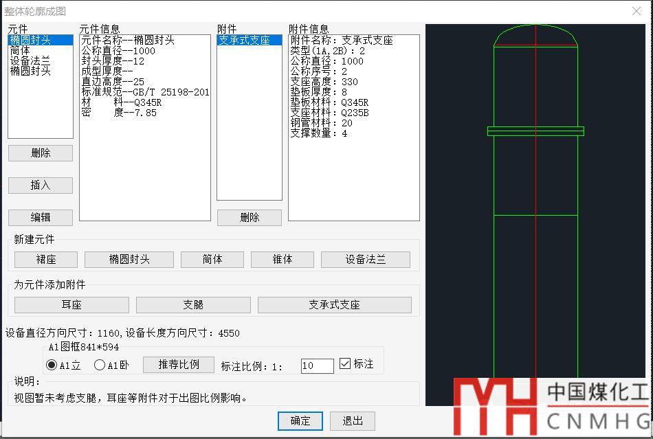 元件有裙座,橢圓封頭,筒體,錐體,設(shè)備法蘭。