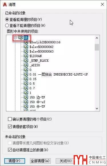 圖紙如果還在繪制過程當中,通常不用對除圖塊以外的其他數(shù)據(jù)進行清理,只需對圖塊,主要是復制粘貼為塊的一些圖塊(名字以A$開頭的圖塊),在清理圖塊時,注意勾選“清理嵌套項目”,可以將圖塊中的未使用的嵌套圖塊一起清理掉。