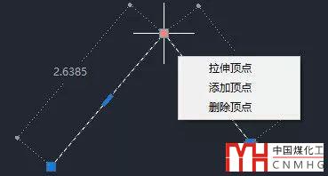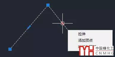 高版本還提供了夾點動態(tài)菜單,當光標停留在直線段端點的時候,會彈出拉伸頂點、添加頂點、刪除頂點的選項;如果光標停留在直線段中點處,會彈出拉伸、添加頂點和轉(zhuǎn)換為圓弧的選項;如下圖所示。