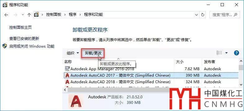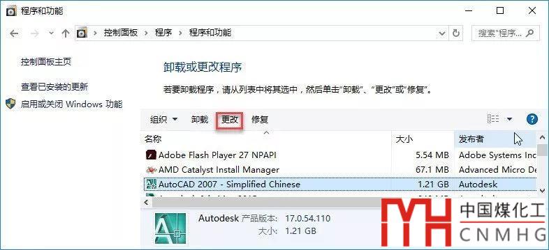 先退出所有CAD程序,打開操作系統(tǒng)的控制面板,不同操作系統(tǒng)的界面不太一樣,找到添加卸載程序的模塊,雙擊打開,在WIN10中叫“程序和功能”對話框,在其中找到安裝的AUTOCAD 2007,在列表框頂部就會出現(xiàn)幾個功能按鈕,如下圖所示。
