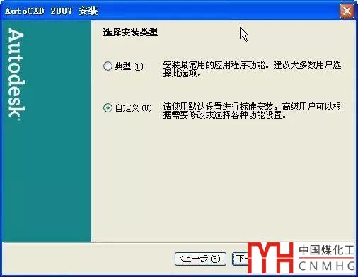 如果重新安裝AUTOCAD 2007,需要到進(jìn)行到“選擇安裝類型“這一頁時選擇“自定義”,如下圖所示。