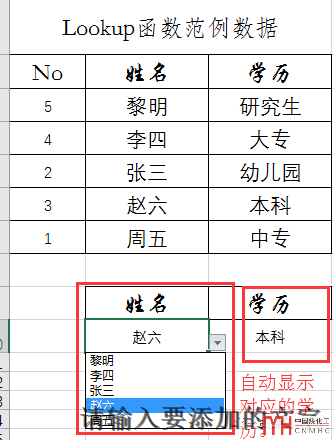 4、在C10單元格中輸入公式:=LOOKUP(B10,B3:B7,C3:C7),按回車(chē)鍵,選擇相應(yīng)的姓名,即可看到對(duì)應(yīng)的學(xué)歷。