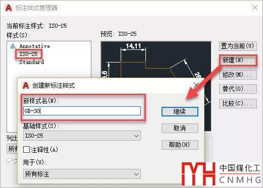 2、選擇ISO-25后單擊新建,這樣就可以ISO-25為基礎(chǔ)創(chuàng)建一個新標(biāo)注樣式,我們可以自己定義一個名字,比如我們要設(shè)置一個字高為3的標(biāo)注樣式,可以將名字設(shè)置為GB-30,如下圖所示。