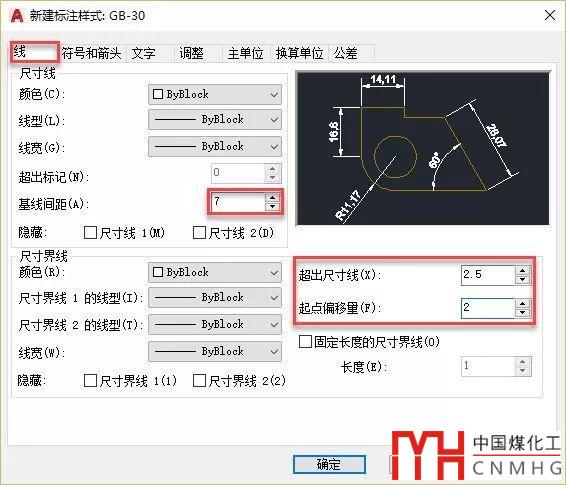 這里重點要知道的其中幾個尺寸,基線間距7-10mm,尺寸界限超出尺寸線2-3mm, 字高2.5-3.5mm,我們就可以開始定義標(biāo)注樣式了。