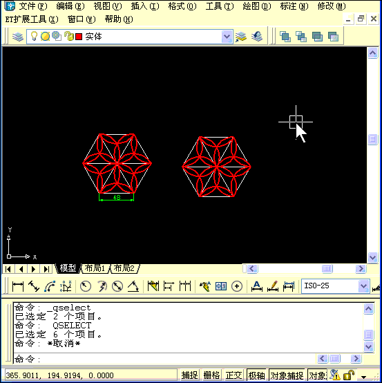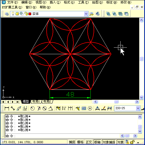 圖形看上去很復(fù)雜且只給了一個(gè)尺寸,但畫起來(lái)并不難,就是畫一邊長(zhǎng)為48的正六邊形,然后連接三條對(duì)角線,剩下的工作就是三點(diǎn)畫弧、陣列、三點(diǎn)畫弧,陣列。