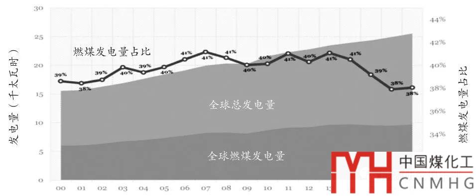 圖1 2000~2017年全球燃煤發(fā)電量及其在全球總發(fā)電量中的占比