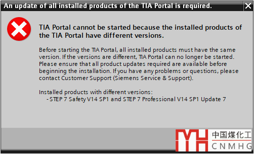 系統(tǒng)原本安裝的是STEP7 Professional V14 SP1 Update7版本,為了使用安全功能,新安裝了STEP 7 Safety V14 SP1。安裝過(guò)程中提示兩者版本不一致,忽略繼續(xù)進(jìn)行安裝。安裝完成后運(yùn)行TIA Portal V14,系統(tǒng)提示錯(cuò)誤信息:Installed products with different versions(安裝的產(chǎn)品具有不同的版本),如下圖: