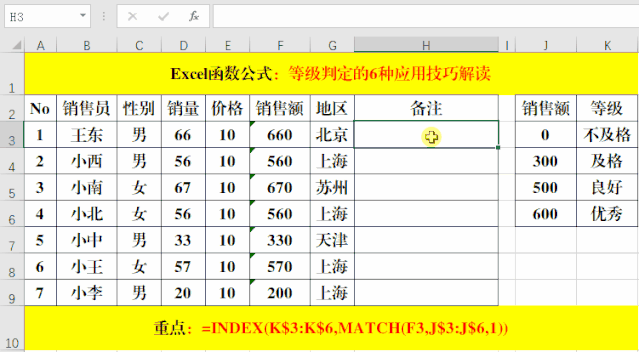 六、Excel等級判定:Index+Match組合函數(shù)法。