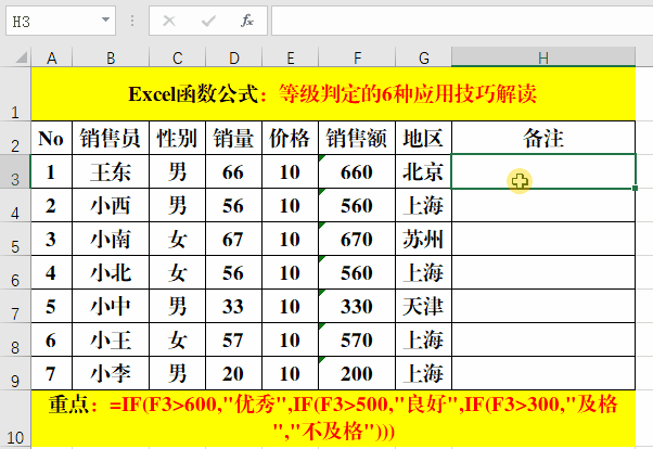 在目標(biāo)單元格中輸入公式:=IF(F3>600,"優(yōu)秀",IF(F3>500,"良好",IF(F3>300,"及格","不及格")))。