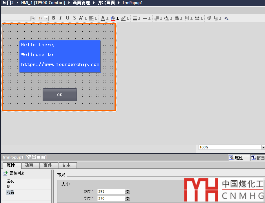 第二步:根據(jù)項目情況修改彈出窗體的大小及內(nèi)容。這里我修改成方正智芯官網(wǎng)的網(wǎng)址(www.founderchip.com),并在【布局】項中修改彈出窗體的大小為:398x310,如下圖: