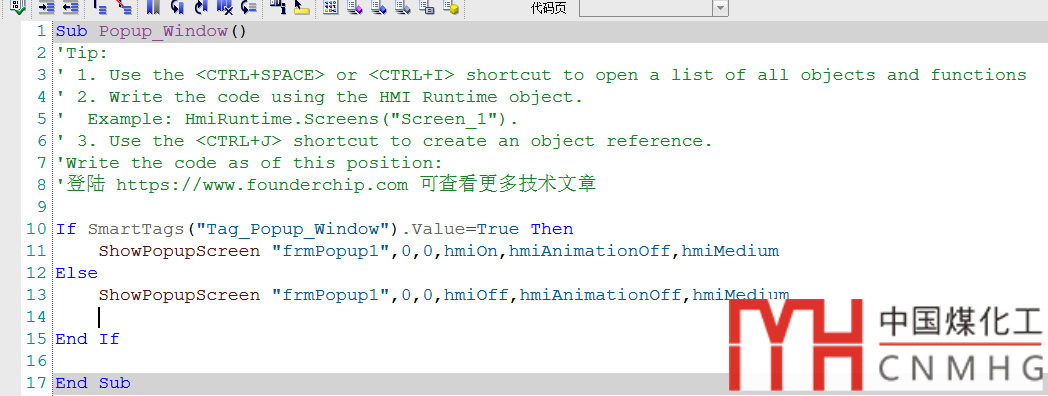 由于Tag_2sec是一個周期為2秒的脈沖信號,當其數(shù)值發(fā)生變化時,將會調(diào)用VB腳本"Popup_Window"。此時,如果Tag_Popup_Window的值為1,則會在屏幕的左上角彈出窗體:frmPopup1;如果Tag_Popup_Window的值為0,則窗體frmPopup1會消失。