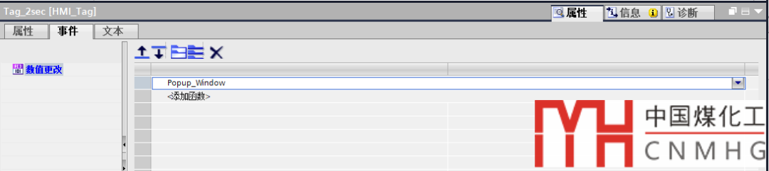 單擊Tag_2sec的【屬性】-【事件】,在其【數(shù)值更改】事件中調(diào)用我們寫好的VB腳本:Popup_Window。如下圖: