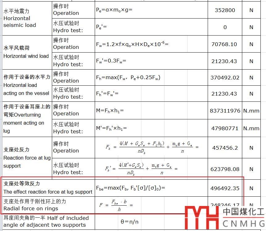 其中剛性環(huán)耳座的上下環(huán)板計(jì)算的難點(diǎn)主要是如何獲得剛性環(huán)耳座支承處的等效反力。此等效反力需要根據(jù)風(fēng)和地震,水壓和操作綜合得出。
