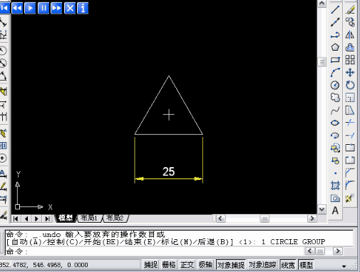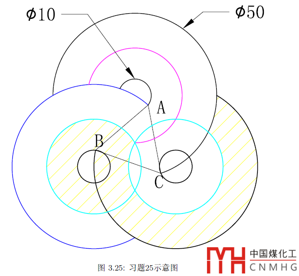 這張圖先不要關(guān)注三角形,先要看隱含條件,首先是幾個(gè)圓的環(huán)形陣列,其中有一個(gè)隱含條件,三個(gè)大圓的分別通過(guò)另兩個(gè)圓的圓心,可以先畫一個(gè)邊長(zhǎng)25的三角形,后面就簡(jiǎn)單了。