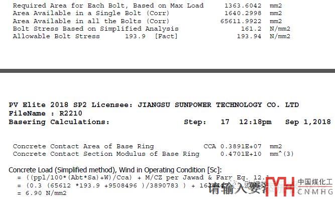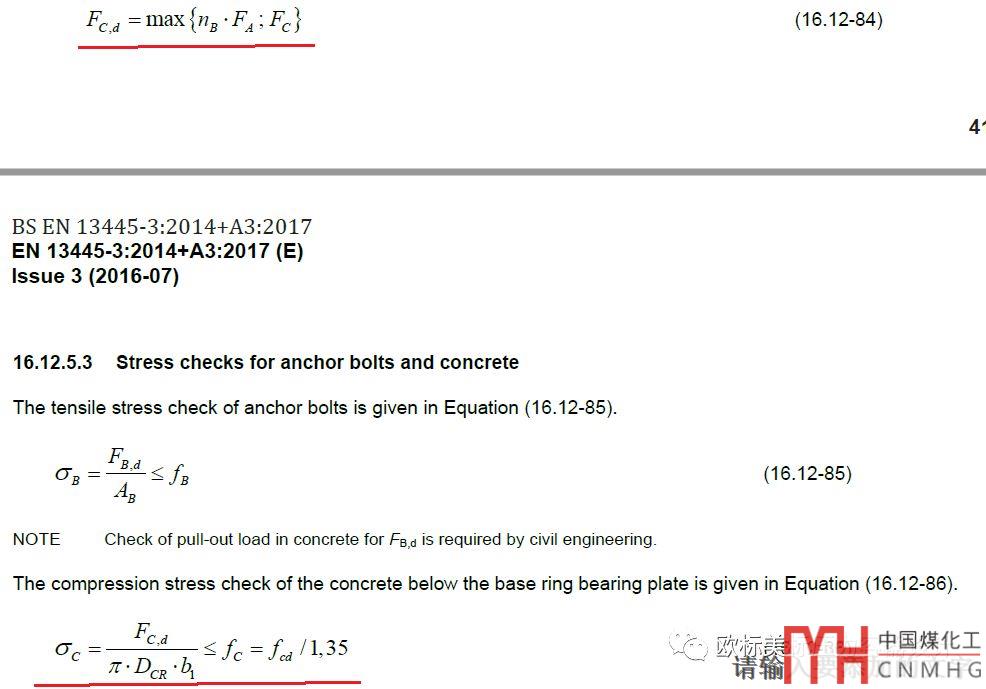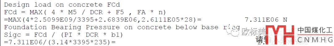 EN13445水泥基礎(chǔ)的壓縮應(yīng)力:max(4M/DC(底板中徑)+Fv(豎直載荷);n(螺栓數(shù)量)xFA(螺栓預(yù)緊力))/底板面積。