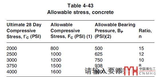 1. 我們先要了解水泥的抗壓能力是有限制的,不是你想要多大就能做到多大。根據(jù)歐洲標(biāo)準(zhǔn)的規(guī)定水泥基礎(chǔ)允許的壓縮應(yīng)力分為四檔C20—5.9MPa;C25—7.4 MPa,C30—8.9 MPa,C35—10.4 MPa(上述數(shù)據(jù)來(lái)源于歐盟設(shè)計(jì)標(biāo)準(zhǔn)EN13445-3見(jiàn)下圖).美國(guó)AISC的標(biāo)準(zhǔn)規(guī)定水泥允許的壓縮應(yīng)力分為五檔:5.5MPa,6.9 MPa,8.3 MPa,10.3 MPa,11.0MPa(單位轉(zhuǎn)換只保留了一位小數(shù))見(jiàn)下圖。國(guó)家不同水泥允許的壓縮應(yīng)力會(huì)有些差別但總的來(lái)說(shuō)差別不大。最大也就10MPa多一點(diǎn)。如果你的地腳螺栓有預(yù)緊,那么水泥的壓縮還和地腳螺栓的預(yù)緊載荷有關(guān)(EN13445有地腳螺栓預(yù)緊的要求)。重量和彎矩不變的前提下底板大小和或螺栓的大小決定了水泥基礎(chǔ)的壓縮應(yīng)力。實(shí)際上水泥的壓縮應(yīng)力和彎矩也有關(guān)。綜上塔器設(shè)計(jì)計(jì)算時(shí),設(shè)計(jì)要考慮水泥基礎(chǔ)。