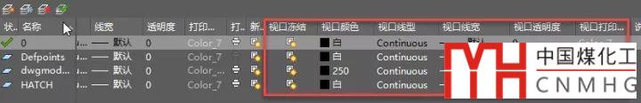 有時我們需要布局中不同視口顯示不同類型的圖形,或者同類圖形在不同視口中顯示成不同效果,CAD針對視口提供了專門的圖層特性控制,比如可以設置在當前視口中凍結圖層或在在當前視口圖層使用不同的顏色、線型、線寬。進入視口后,打開圖層管理器,后面會增加幾列參數(shù),如下圖所示。