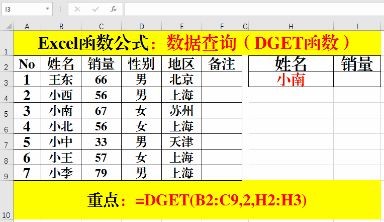 在目標單元格中輸入公式:=DGET(B2:C9,2,H2:H3)。