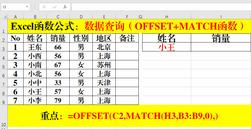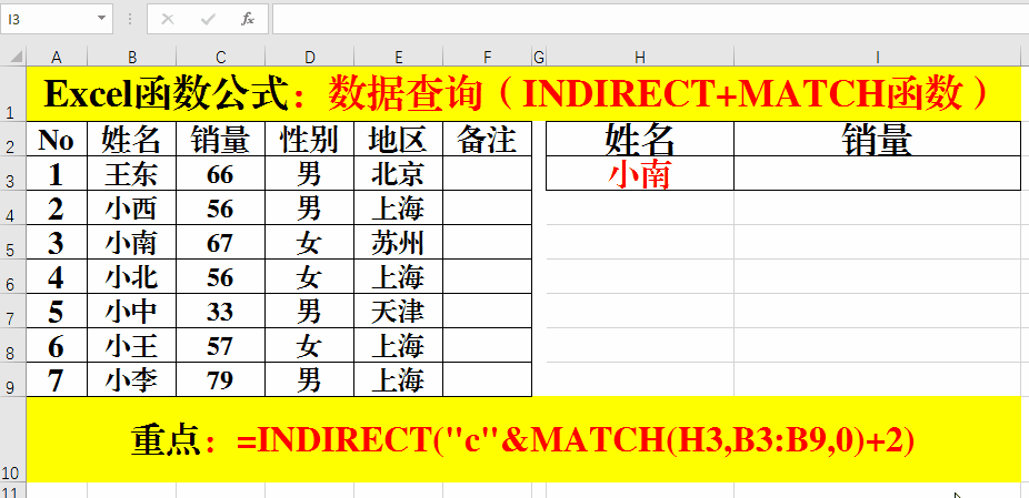 公式中MATCH(H3,B3:B9,0)+2部分加2的原因是我們要查詢的數據是從第3行開始的,所以前面的兩行要計算在里面,否則就是從C1開始查詢,會導致錯誤。