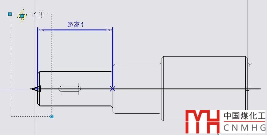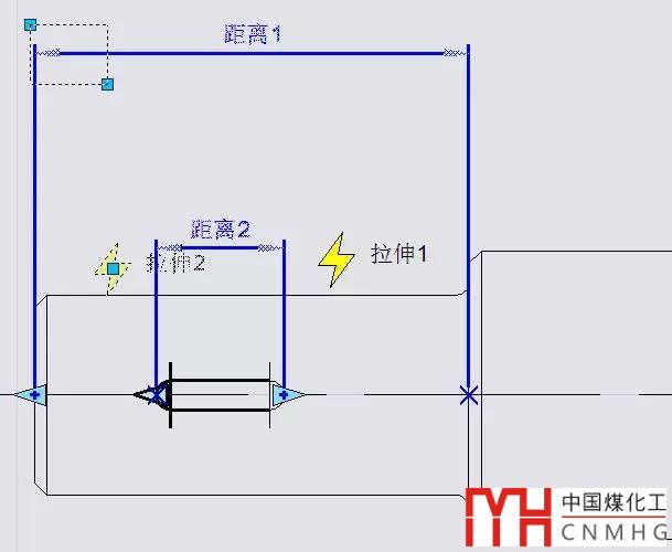 創(chuàng)建一個拉伸動作,選擇距離參數為基準參數,參數左側點為關聯參數點,然后框選為階梯軸左側和參數作為拉伸動作的對象(圖中粗線顯示的對象),如下圖所示。
