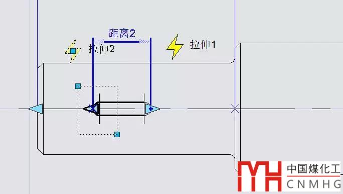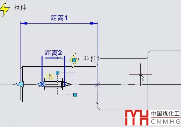 如果我們反過來,想用軸端的拉伸來控制鍵的拉伸,可以打開“距離2”的鏈動作,而關閉“距離1”的鏈動作,在設置軸拉伸的時候選上“距離2”,在設置鍵拉伸時不選擇“距離1”,就可以得到需要的效果,如下圖所示。