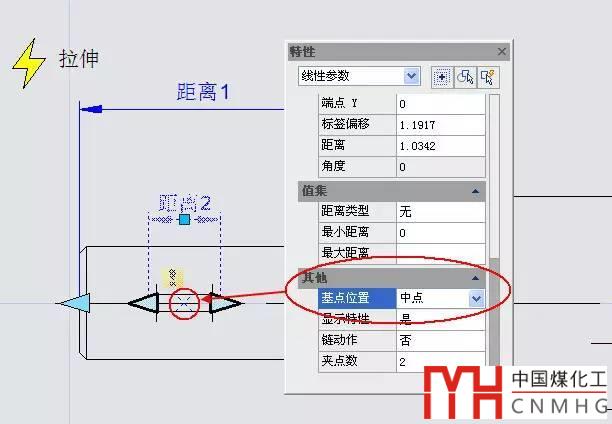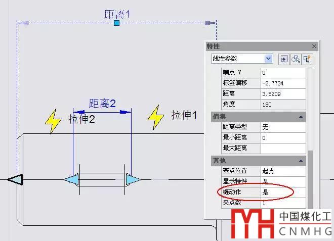 選中“距離1”線性參數,將其屬性的“鏈動作”欄由“否”改為“是”,如下圖所示。