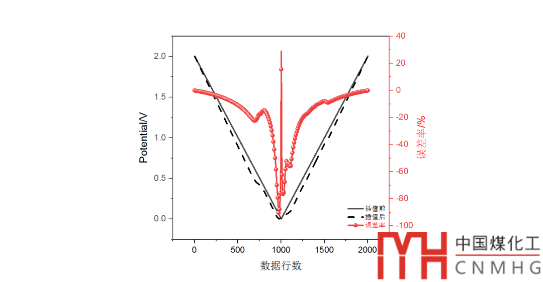 譚編對(duì)插值前后的電位和誤差率繪圖如下,誤差還是很大的,還是建議大家采用儀器參數(shù)的設(shè)置比較準(zhǔn)確。