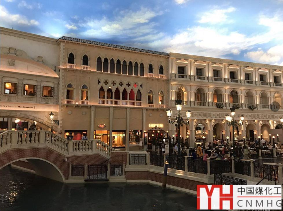 酒店二樓,建了小河,還有游船在劃,天空云彩是畫上去的,很有特色。