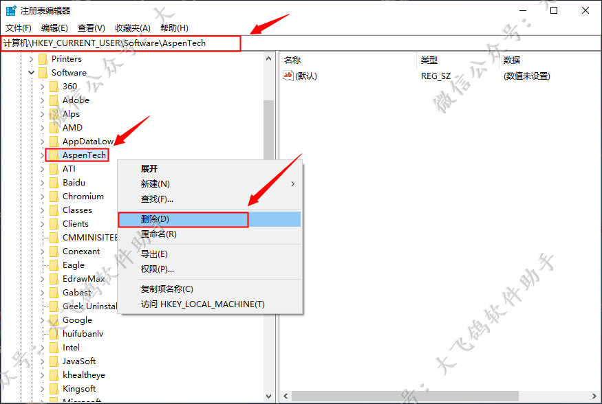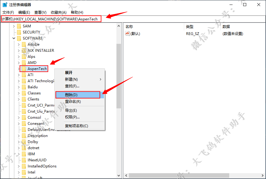 來到路徑HKEY_LOCAL_MACHINESOFTWAREAspenTech,刪除這個(gè)注冊(cè)表。