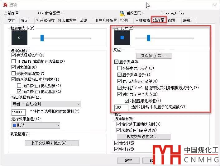 其實(shí)如果了解CAD關(guān)于夾點(diǎn)顯示設(shè)置的相關(guān)選項(xiàng)就不難理解了,關(guān)于夾點(diǎn)顯示的控制選項(xiàng)都在選項(xiàng)對(duì)話框的“選擇集”選項(xiàng)卡中,如下圖所示。