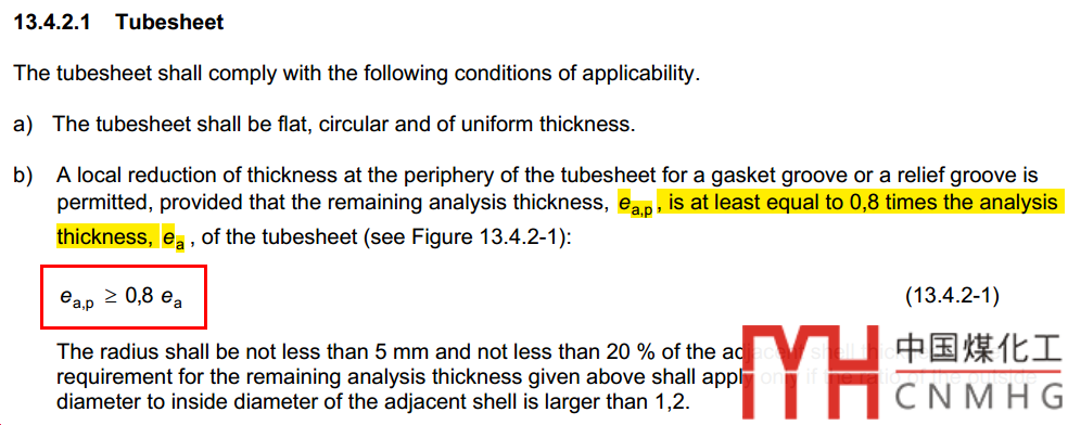 GB-151如何說(shuō)這個(gè)問題呢?直接的答案是沒有。不過從管板的受力來(lái)說(shuō),對(duì)于U形的夾持式的管板,一般最大彎曲應(yīng)力在中心,邊緣的夾持處應(yīng)力值相對(duì)較低。所以理論上,不應(yīng)該計(jì)入管板厚度。只要計(jì)算時(shí)采用管板中心厚度就行了。