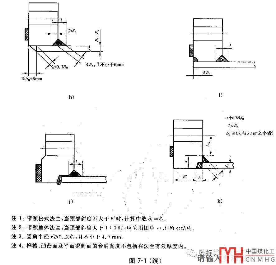 短節(jié)厚度至少為12mm或16mm(和壓力等級及直徑有關(guān)),按GB/T 150整體法蘭背部開坡口的深度大于等于短節(jié)厚度,焊腳腰高大于等于短節(jié)厚度才能計算按整體法蘭。很明顯NB/T 47022的乙型法蘭的坡口10mm,焊腳高10mm不滿足GB/T 150任意式法蘭按整體法蘭計算的結(jié)構(gòu)要求??赡苡腥藭fi)、j)沒有明確坡口和焊腳的要求。